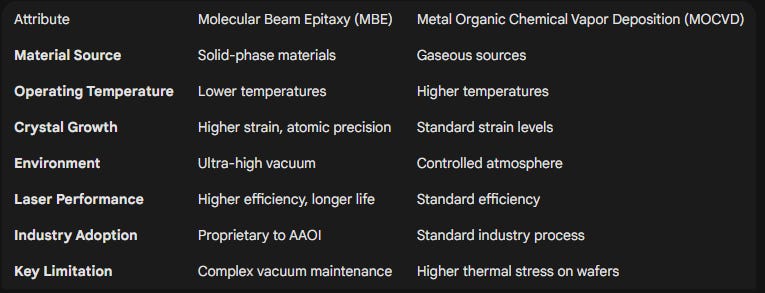 The primary technical differentiator—and the core of the company’s competitive advantage—is its use of Molecular Beam Epitaxy (MBE) for semiconductor laser manufacturing. While the vast majority of the communication optics industry utilizes Metal Organic Chemical Vapor Deposition (MOCVD), Applied Optoelectronics has pioneered a proprietary MBE fabrication process that it believes is unique in the industry.