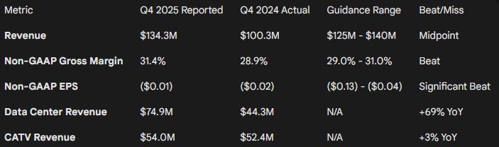 Customer Concentration: A persistent risk factor for the company remains its reliance on a narrow base of customers. The top 10 customers represented 96% of total revenue in Q4. Specifically, one CATV customer accounted for 39% of total revenue, while two data center customers accounted for 31% and 21%, respectively. The data center customers are widely understood to be Microsoft and Amazon, highlighting the company’s success in qualifying for the world’s largest AI infrastructure buildouts.