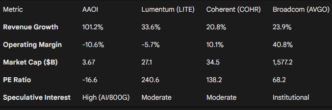 Applied Optoelectronics occupies a distinct niche in the “Zacks Electronics - Semiconductors” industry and the broader optical communications sector. It is frequently compared to larger, more established peers such as Coherent (COHR), Lumentum (LITE), Ciena (CIEN), and semiconductor giants like Broadcom (AVGO) and Marvell (MRVL).