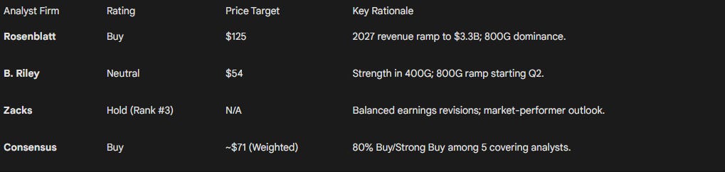 Bearish analysts highlight that the stock trades at 84x forward earnings and that its massive gains—surging 123% over the past year—may have already priced in the 800G growth story. Concerns persist about the company’s reliance on two customers for 88% of its revenue and the potential for margin pressure if competitors like Jabil (JBL), which recently acquired Intel’s silicon photonics unit, successfully scale their own 800G solutions.