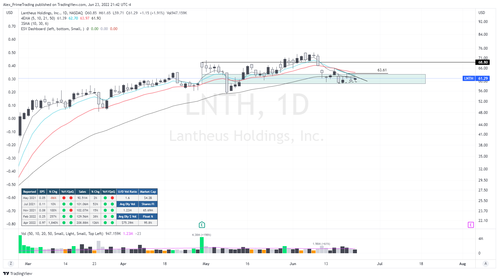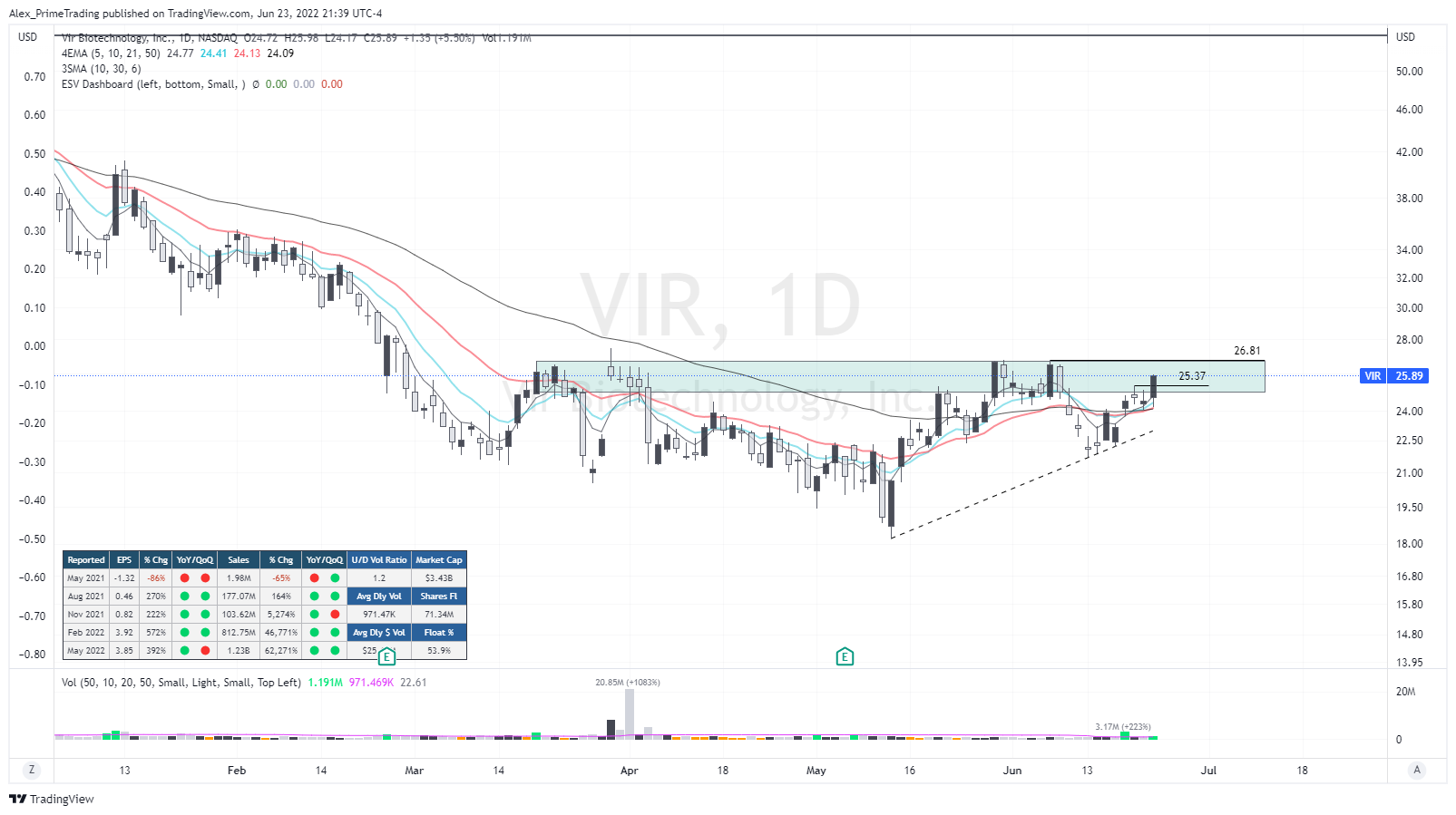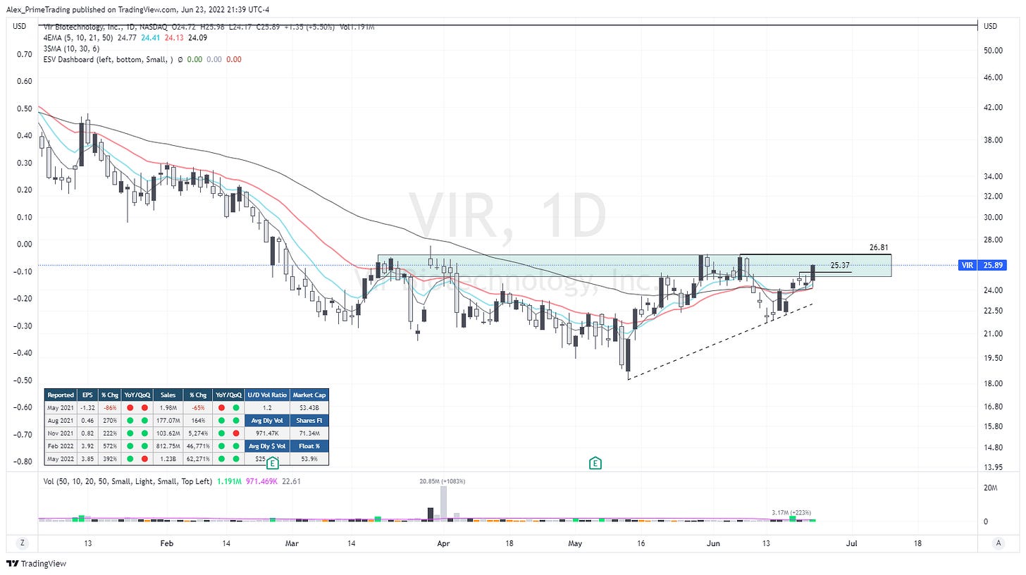 A stock in the biotech leading sector that is about to breakout of his stage 1 base. Today would have been a good entry off the 25.37$ pivot retake, so if we get the chance to enter on this level with a limit order it would be ideal…otherwise an entry off 26.81$ base top will be a decent entry playing the base breakout. Of note, look at these fundamentals…it’s simply crazy. 1.28 millions $ in revenues to 1.23$ BILLIONS in 5 QUARTERS. insane.