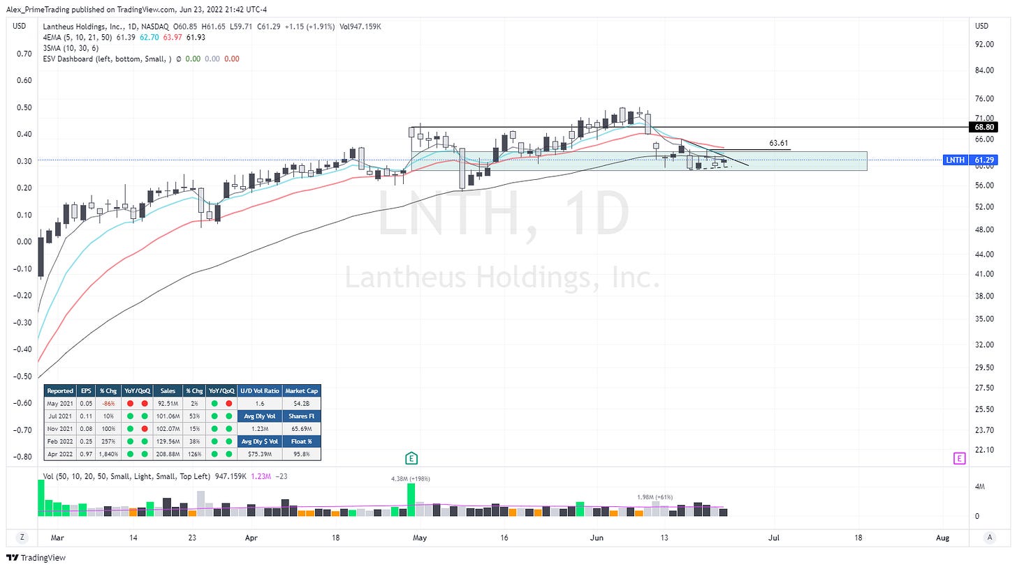 Recent leading name that seems to being out of selling interest right in that support area. We are seeing higher lows in that consolidation and a clear DTL working & squeezing the price even more. I will be interested in playing that DTL or 63.61$ recent swing high.