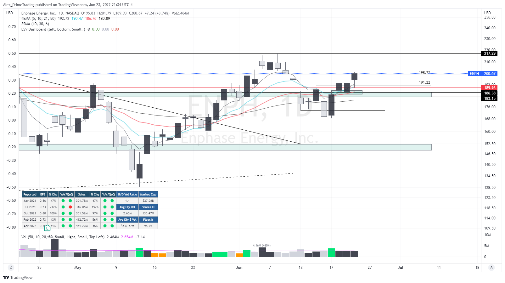 ENPH - I tried to open the position this morning when we tested back the 191.22$ pivot, but closed it for a good profit before the market sold off around noon. I then re-opened it quickly after taking the TNA trade at the 198$ level in anticipation of a 198.73$ entry pivot from last night letter.