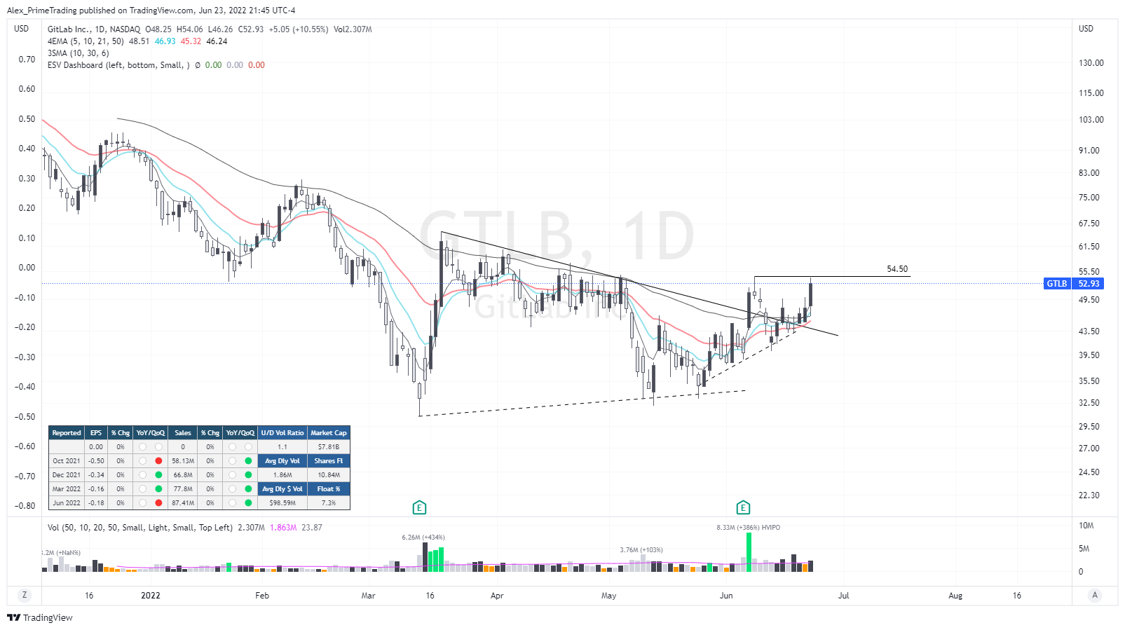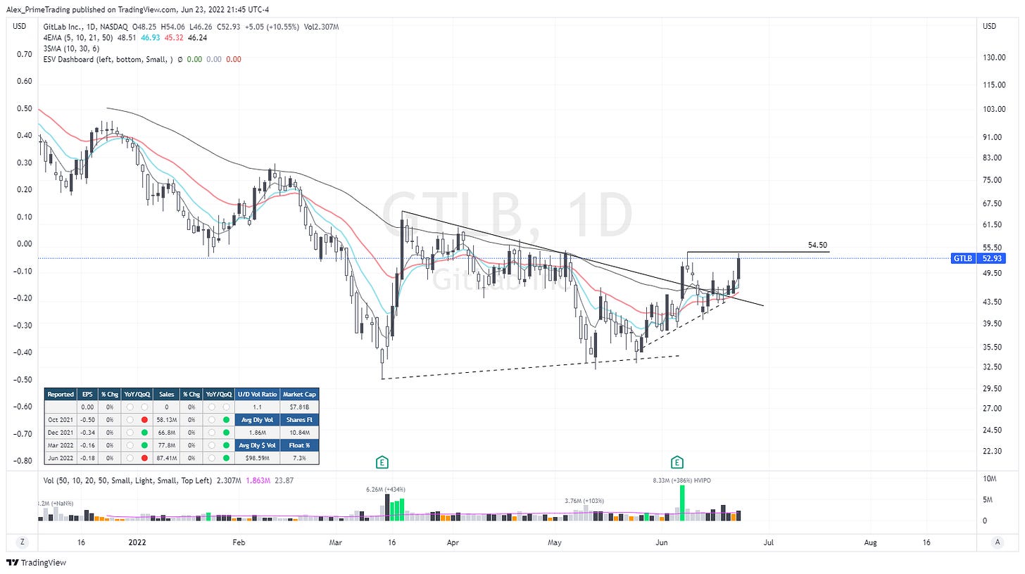 Also a stage 1 base/wedge breakout on this software name. I see a WBPB setup as we broke out of the wedge on ER 2w ago, then we came to retest the DTL before trying to reclaim recent swing high today. That 54.5$ recent swing high is the entry pivot.
