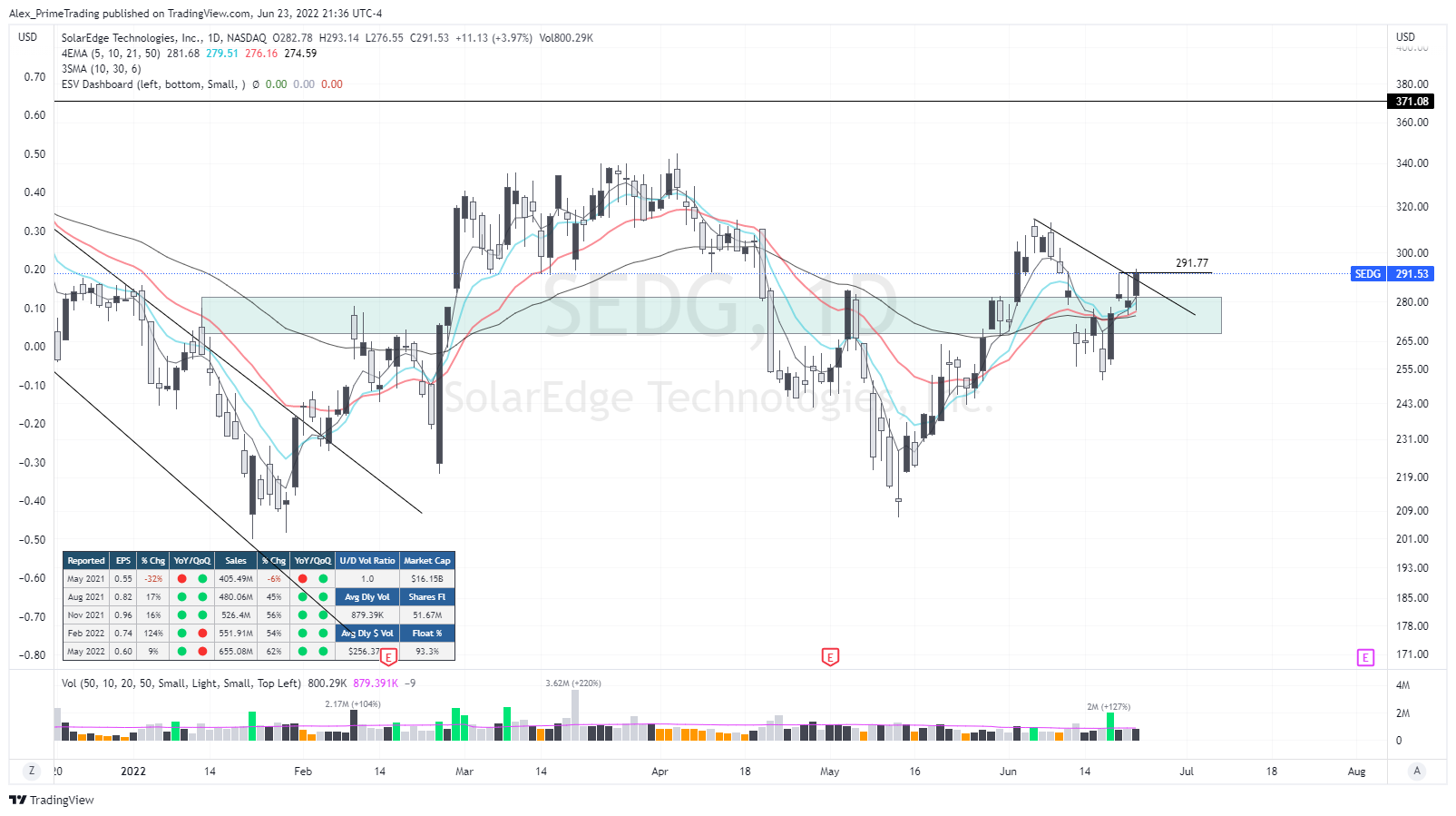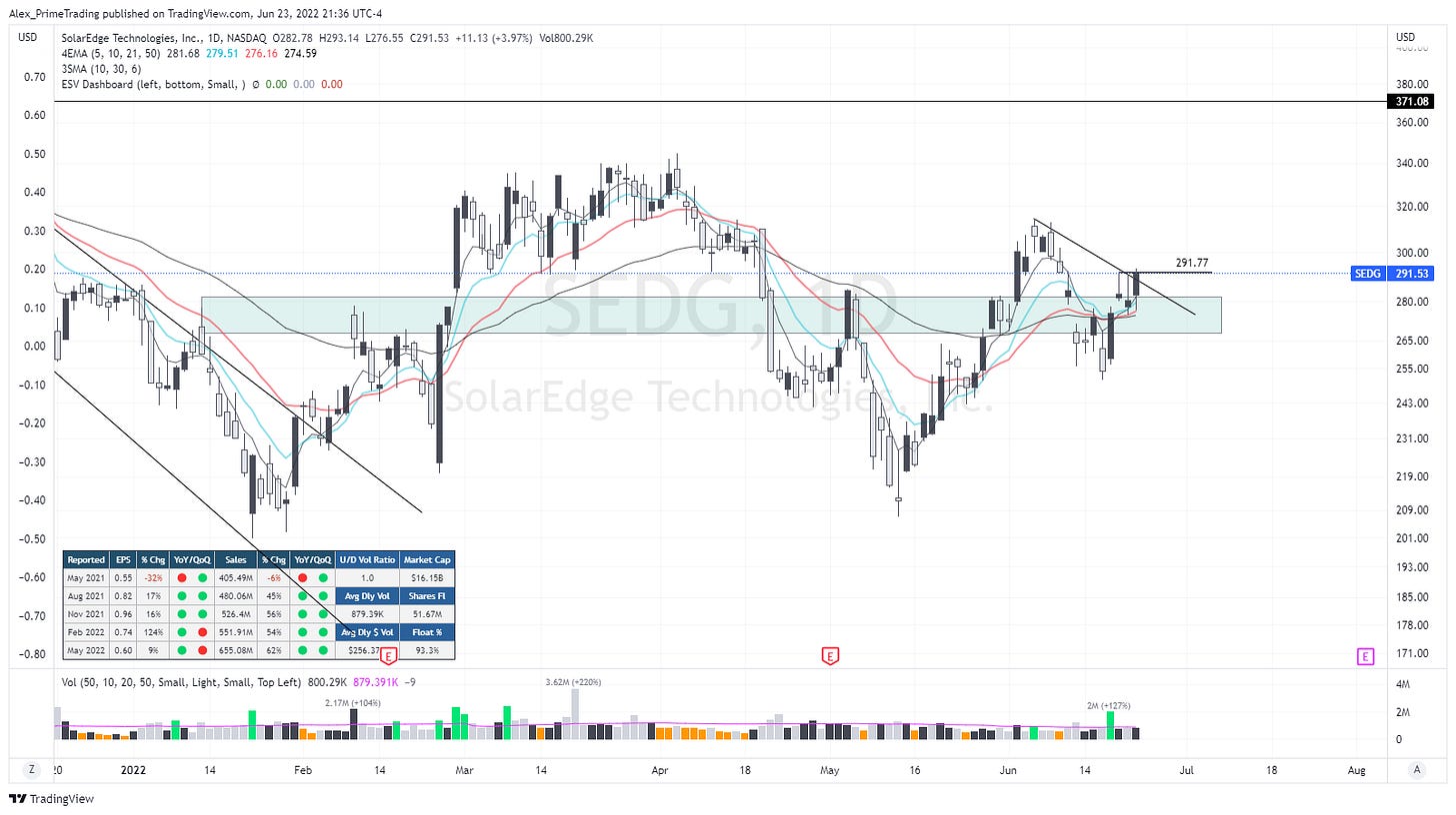 Another Solar name setting up nicely right after ENPH. We have a BORS setup following last week reclaim of the recent support area. We came back to test the level Tuesday & yest’d right at the 21dma and today almost retook recent swing high of 291.77$