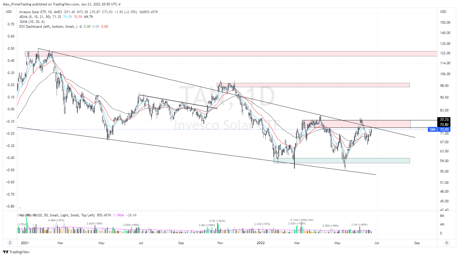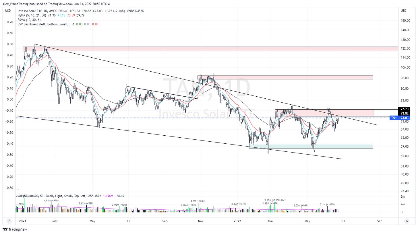 SOLAR (TAN) Had a decent mid-pack day. We are still within that larger channel DTL from ‘21 peak…but we are getting REALLY CLOSE to try another breakout attempt. Might even be tomorrow. If we breakout of that wedge and we can also b/o of that supply zone above I have in red, then this sector can really push higher fast imo.