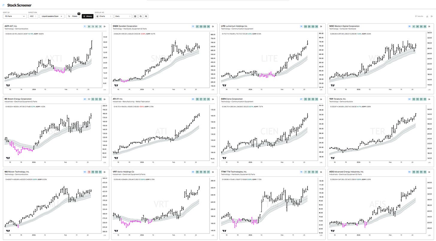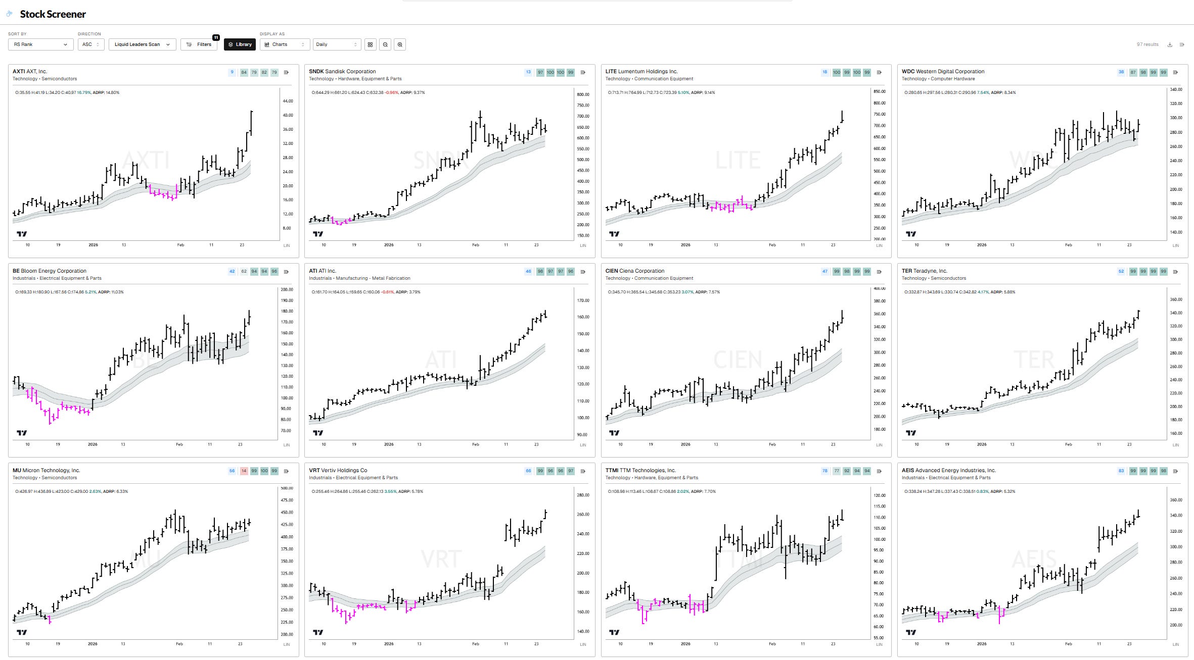 AXTI, SNDK, LITE, WDC, BE, ATI, CIEN, TER, MU, VRT, TTMI, AEIS, GLW, STX, WULF, SATS, LRCX, KEYS, GEV, PL, HWM, COHR, MKSI, TPR, CAT, AMAT, MOD, AAOI, FTAI, ASML, NVT, GNRC, RRX, MTSI, PWR, JBL, STM, NRG, XPO, NBIS, CMI, ENTG, HUT, CLS, TEL, Q, TSEM, ON, GRMN, NXT