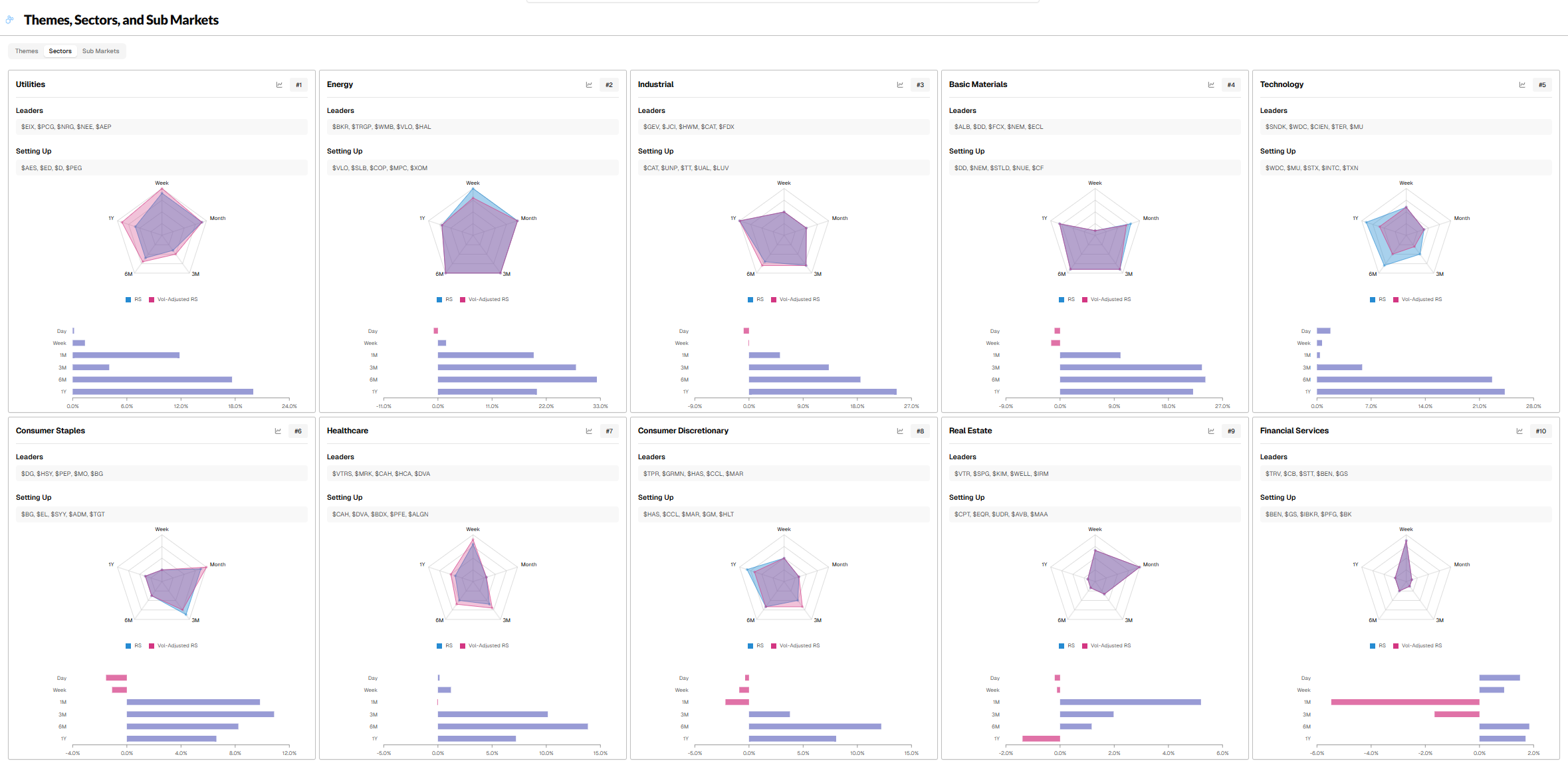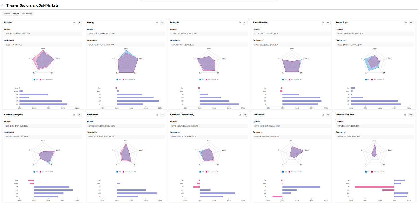 Top 10 Leading SECTORS - Relative Strength RANK sorted (W/ Leading & Setting up Stocks)