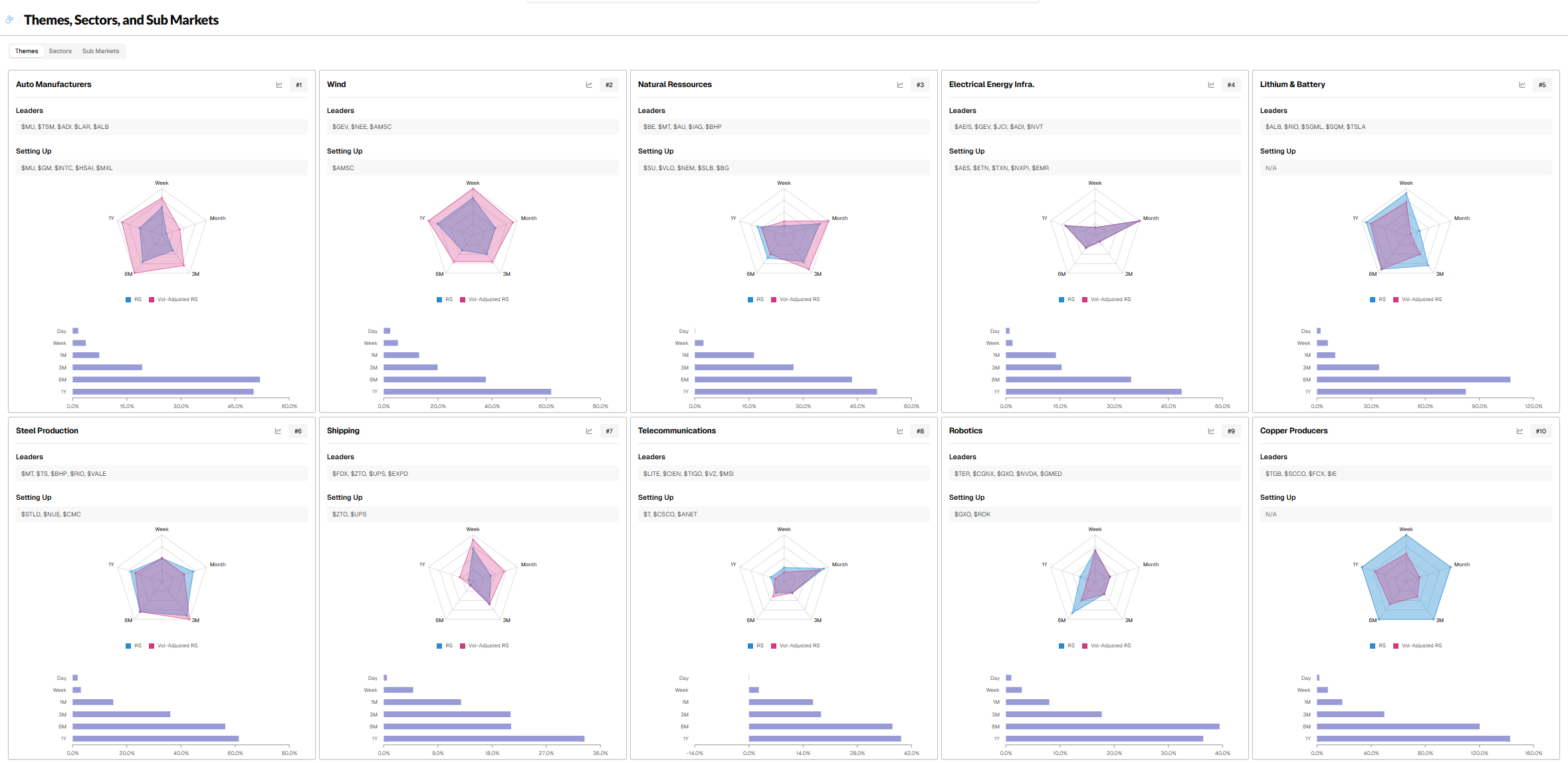 Top 10 Leading THEMES - Relative Strength RANK sorted (W/ Leading & Setting up Stocks)