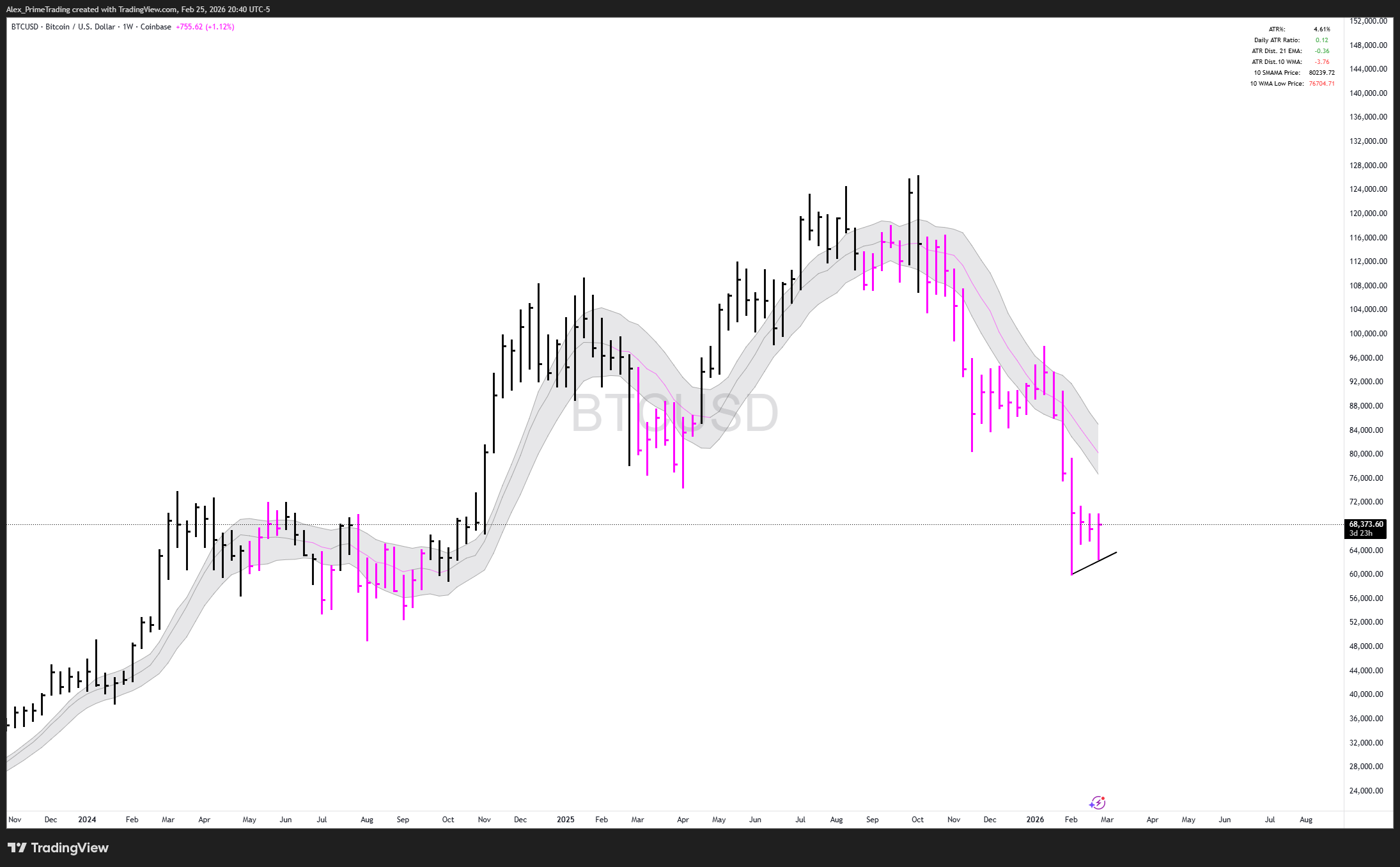 Downtrend below a declining 10wma-structure. Potential higher low being made.