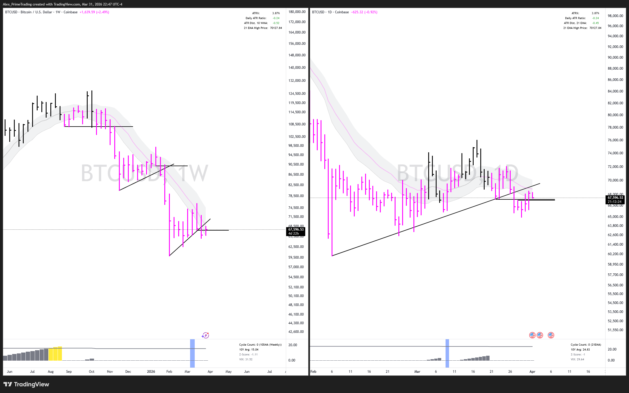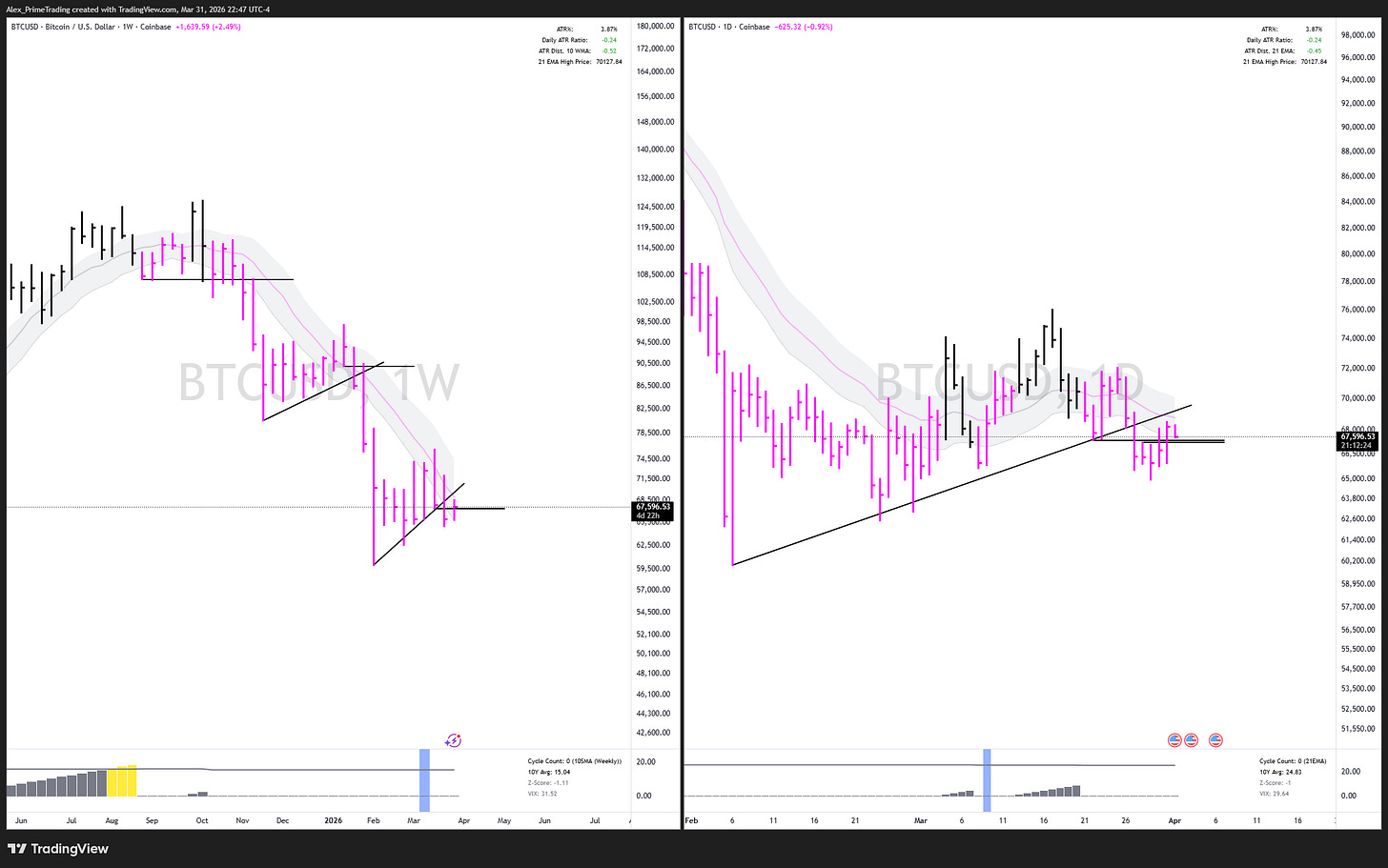 Bitcoin (BTC) DOWNTREND BELOW DECLINING 21dma & 10wma structures. Retest of those structures right now. Rejection or reclaim?