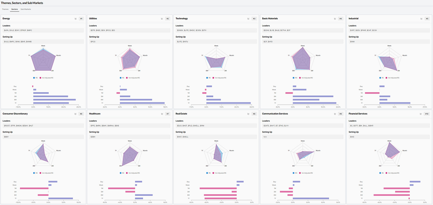 Top 10 Leading SECTORS - Relative Strength RANK sorted (W/ Leading & Setting up Stocks)