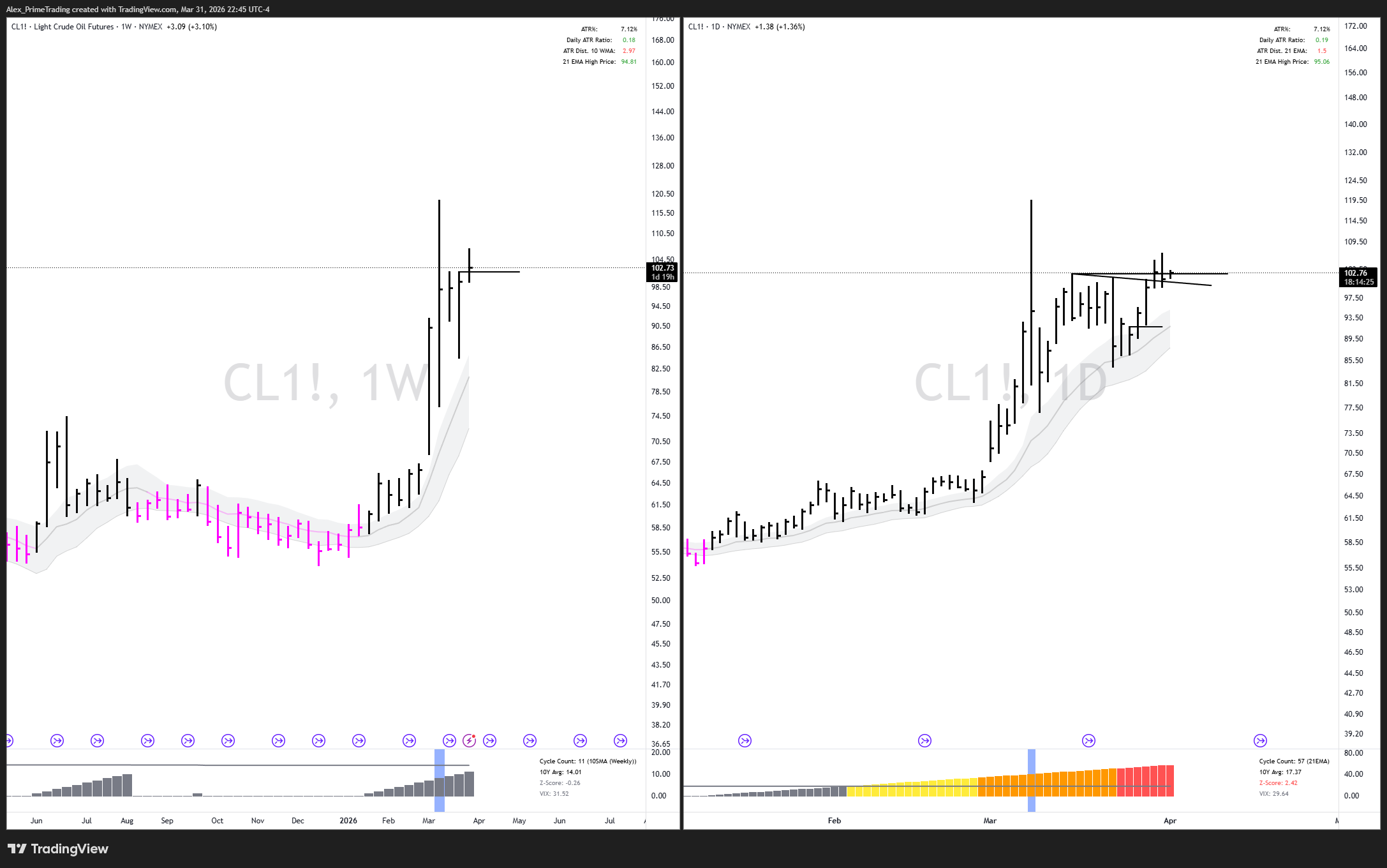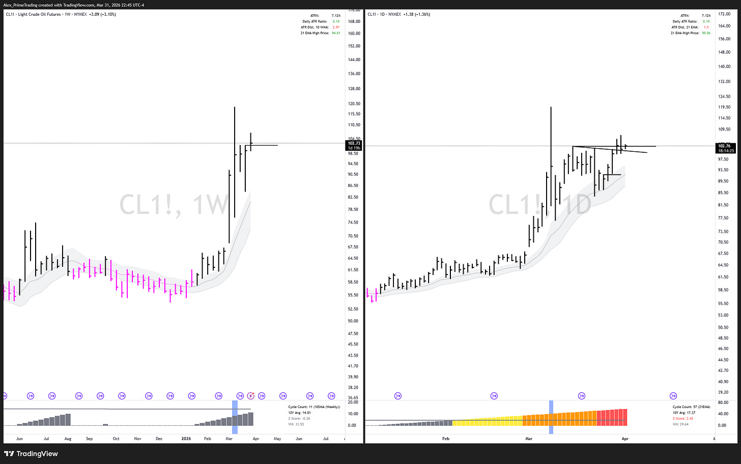 This #CL_F chart is driving the market right now; the inverse correlation is near-perfect, even on a tick-by-tick basis. Market fears high Crude Oil prices.