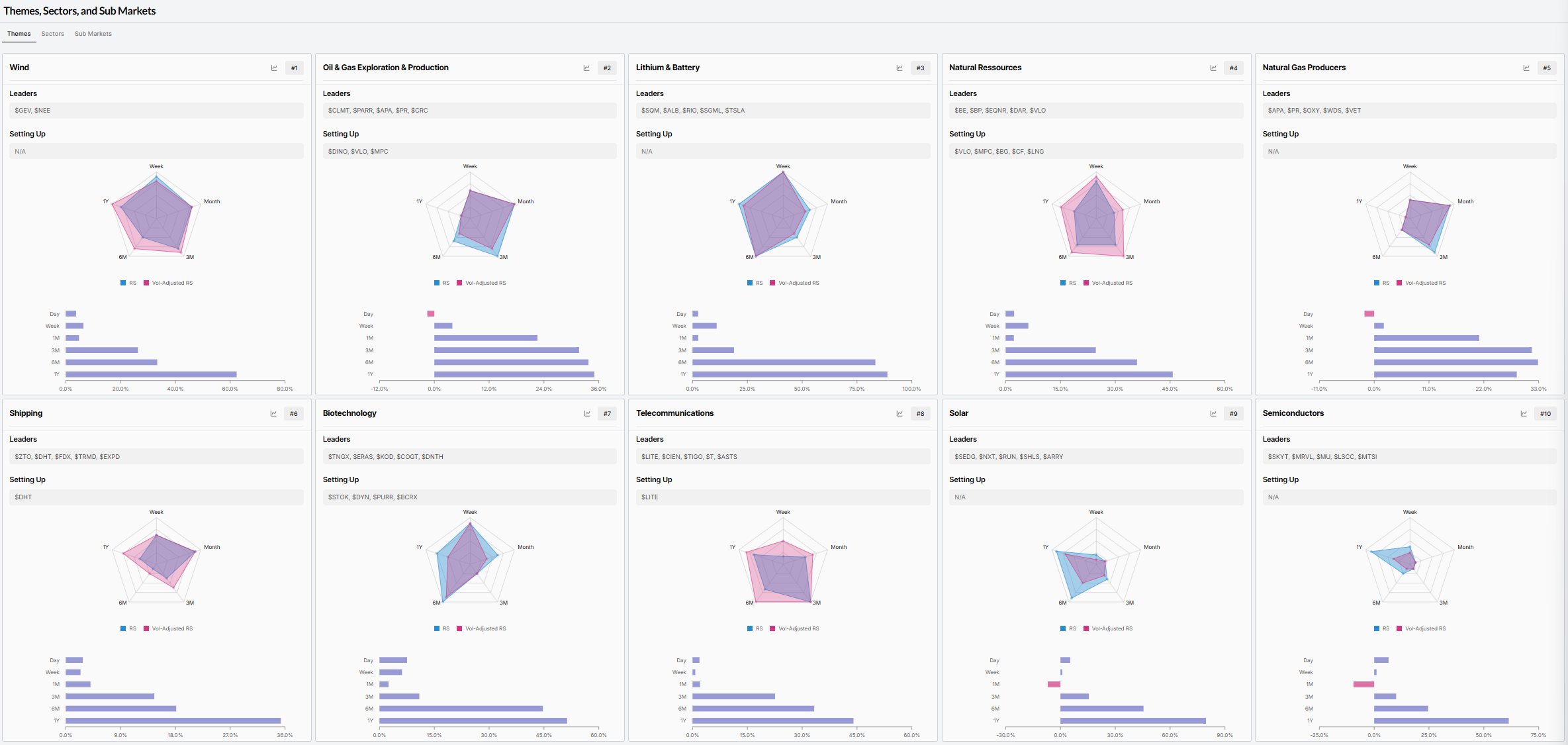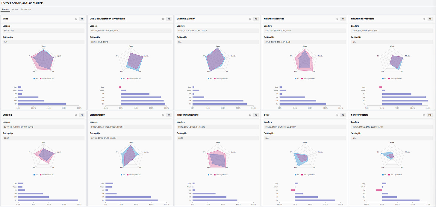 Top 10 Leading THEMES - Relative Strength RANK sorted (W/ Leading & Setting up Stocks)