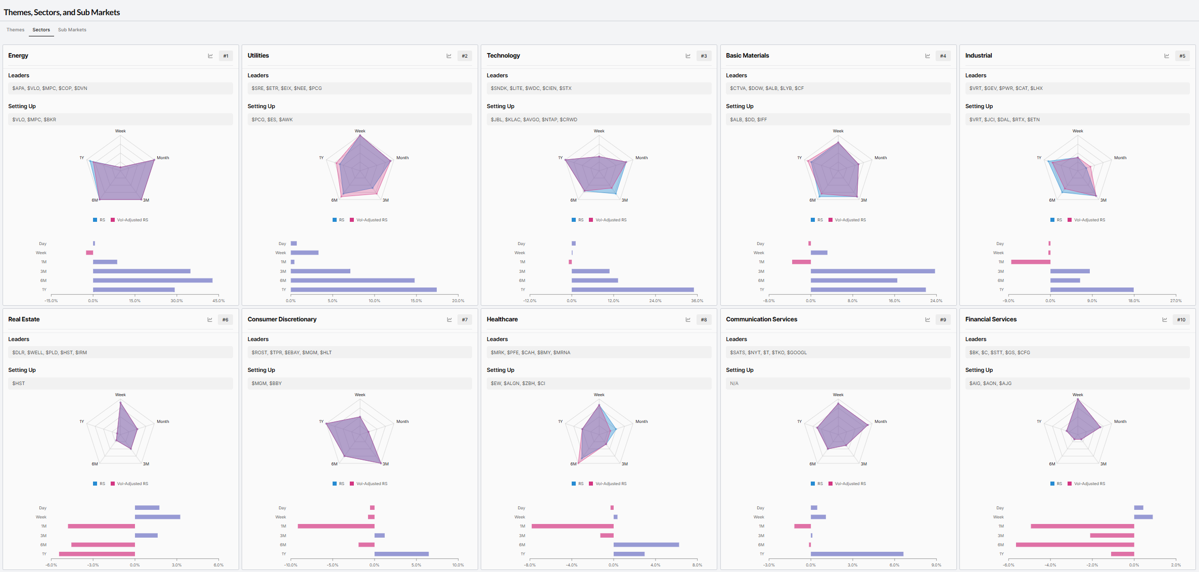 Top 10 Leading SECTORS - Relative Strength RANK sorted (W/ Leading & Setting up Stocks)