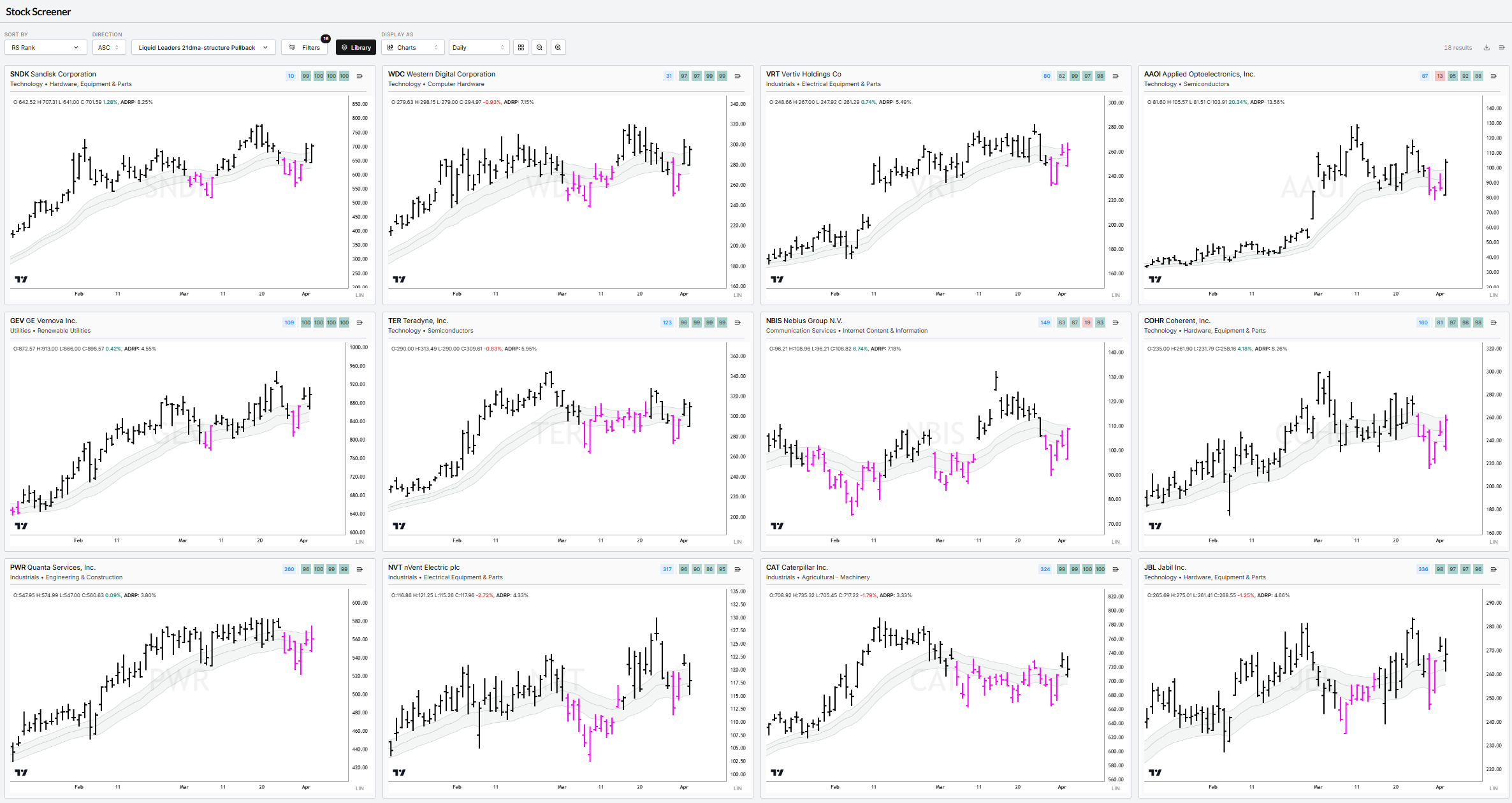 SNDK, WDC, VRT, AAOI, GEV, TER, NBIS, COHR, PWR, NVT, CAT, JBL, STM, MTSI, KLAC, KEYS, XPO, NET