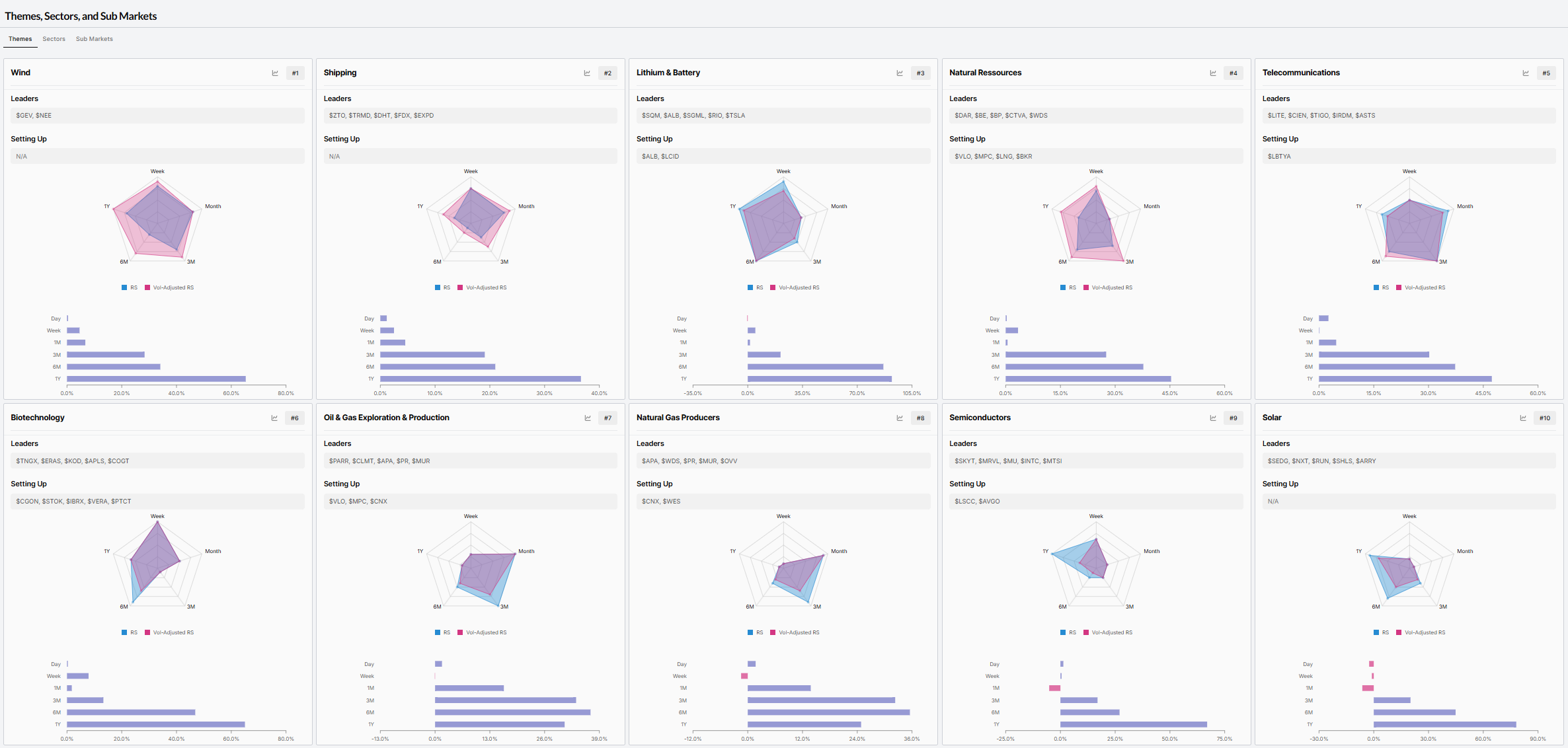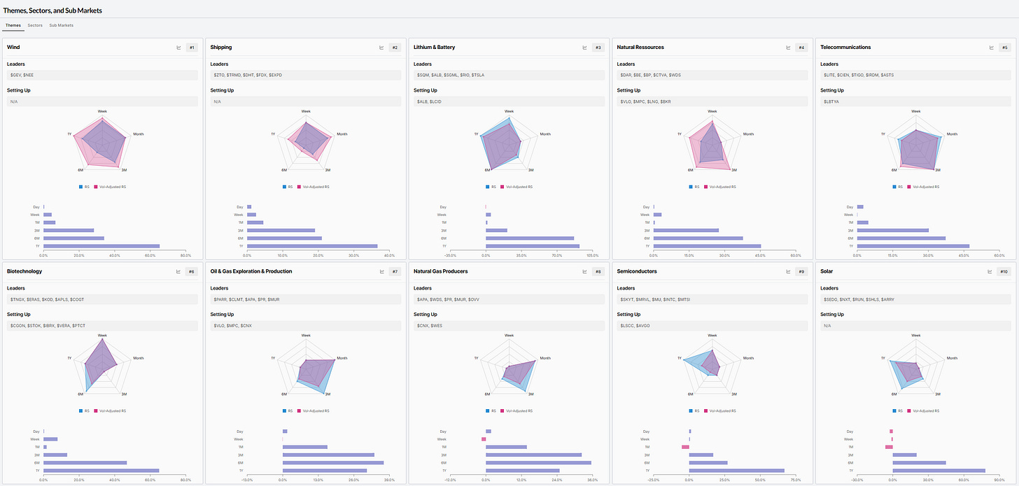 Top 10 Leading THEMES - Relative Strength RANK sorted (W/ Leading & Setting up Stocks)